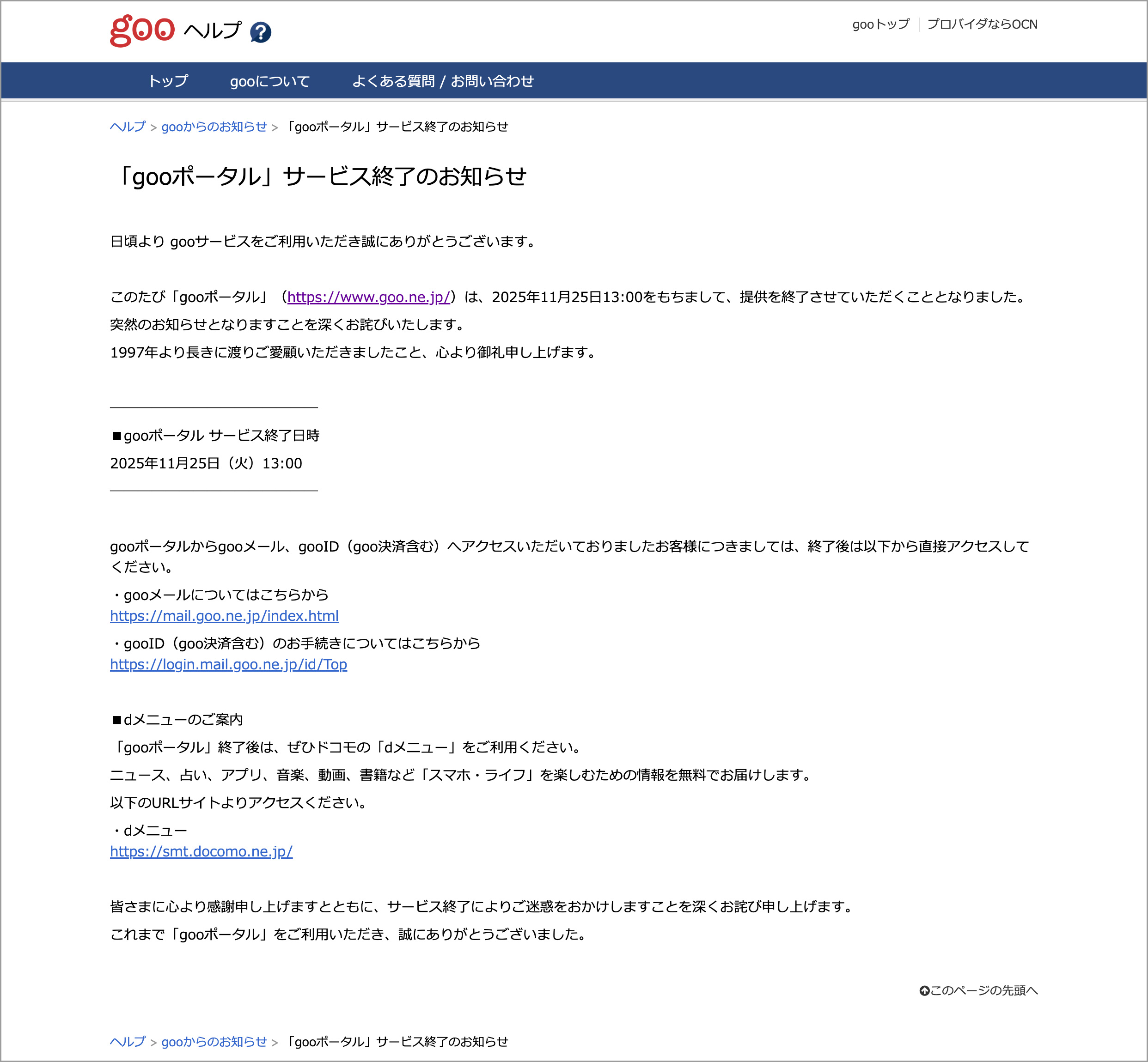 NTTドコモが運営するインターネット・ポータルサイトの「gooポータル」が、2025年11月25日13時をもってサービス終了することになりました。