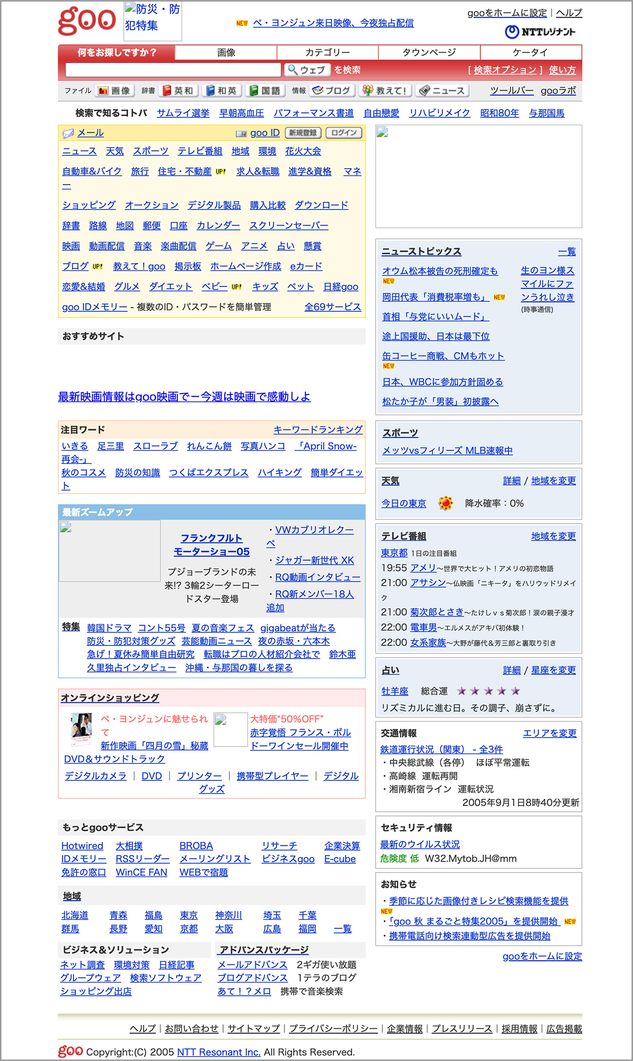 こちらは2005年頃。ニュースだけでなく天気予報や占いなども追加され、この頃にはポータルサイトとしての形が出来上がった感じがします。
