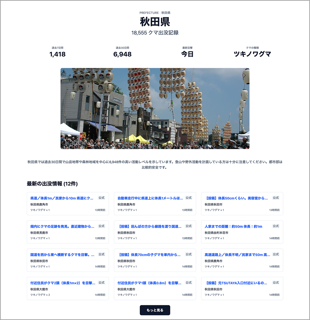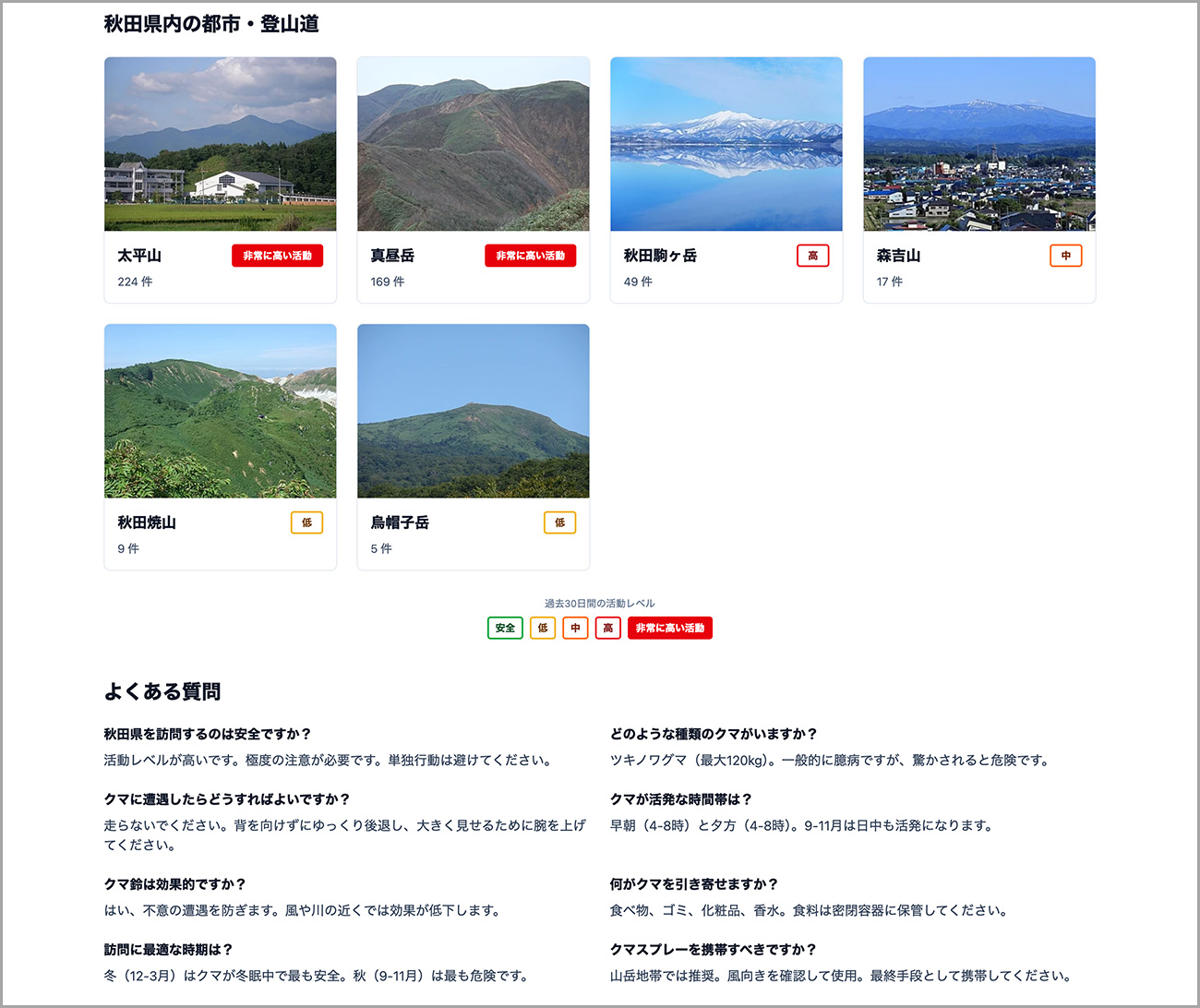 また地域ごとの出没情報や、クマの活動が活発なエリアをまとめたページも用意されています。
