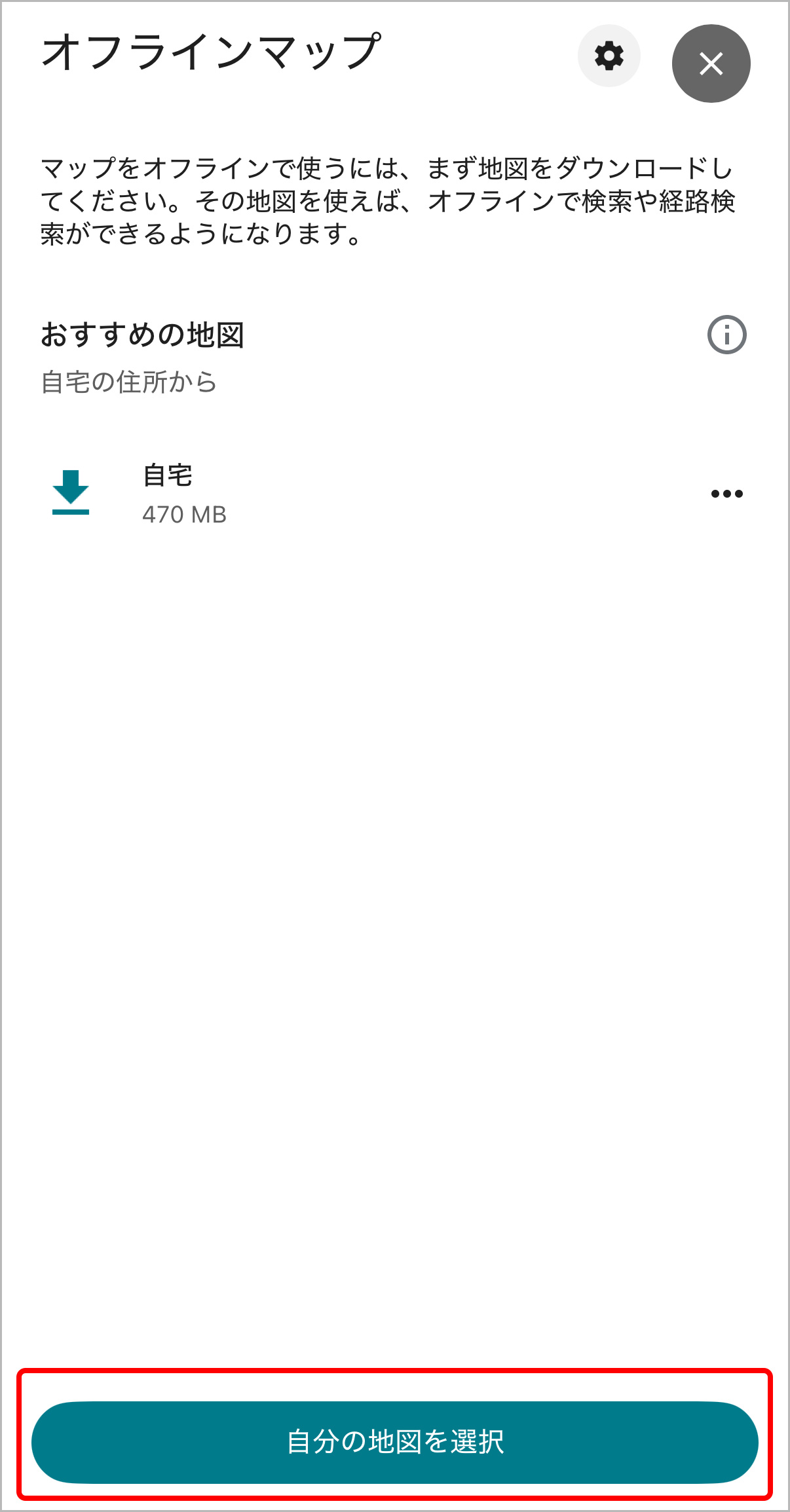 「オフラインマップ」のメニューが表示されました。ここですぐに自宅周辺のマップをオフラインマップにすることができますが、任意の場所を保存したい場合は一番下の「自分の地図を選択」をタップします。
