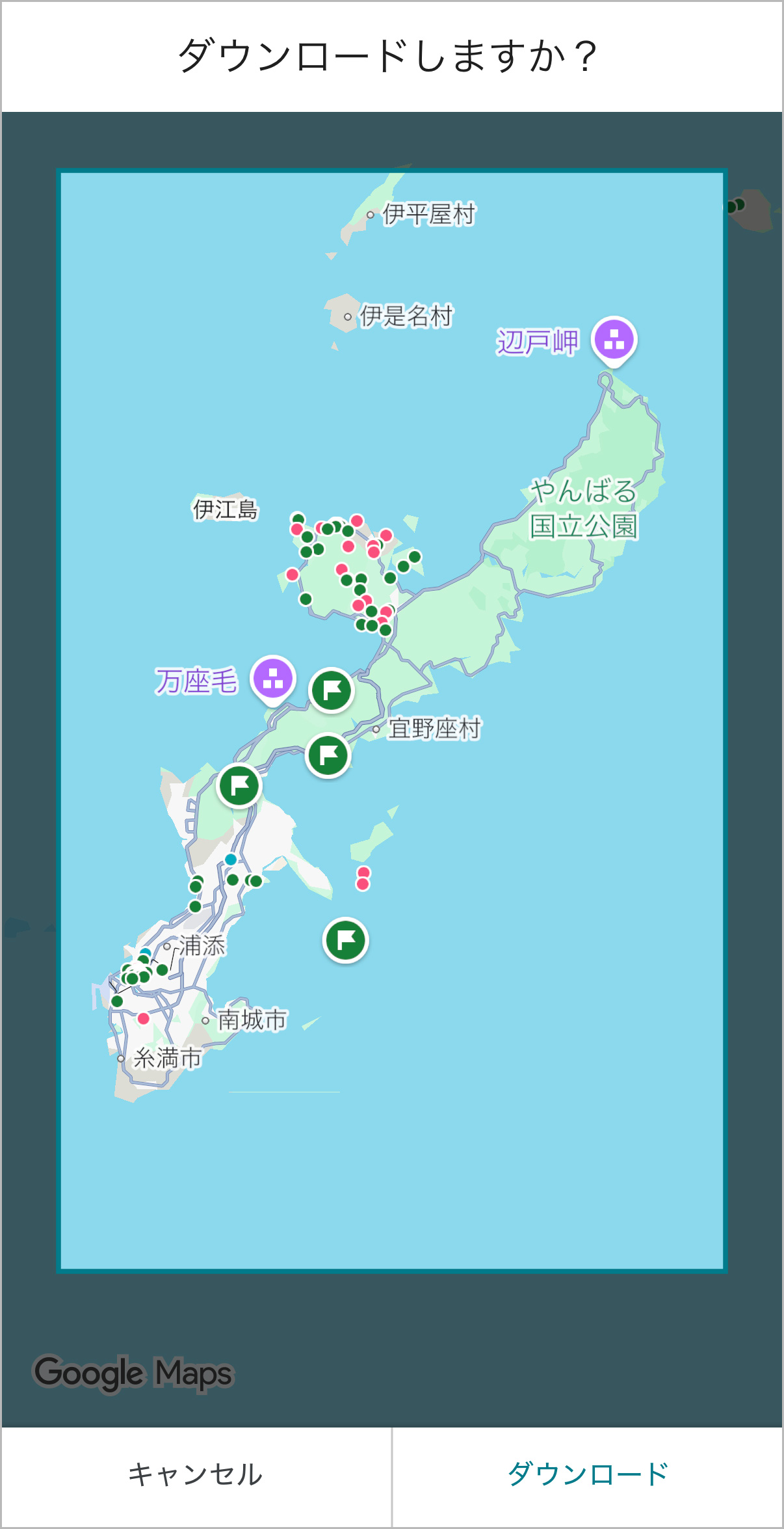 今回は沖縄本島を選択してみました。そして「ダウンロード」をタップすれば地図データを保存できます。なかなか容量があるので、Wi-Fiに繋がっている環境でダウンロードしましょう。