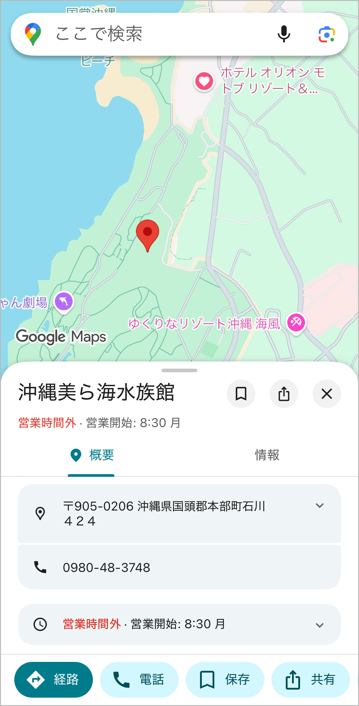 すると、周辺の地図は問題なく表示されていますし、美ら海水族館の情報もちゃんと確認することができました。