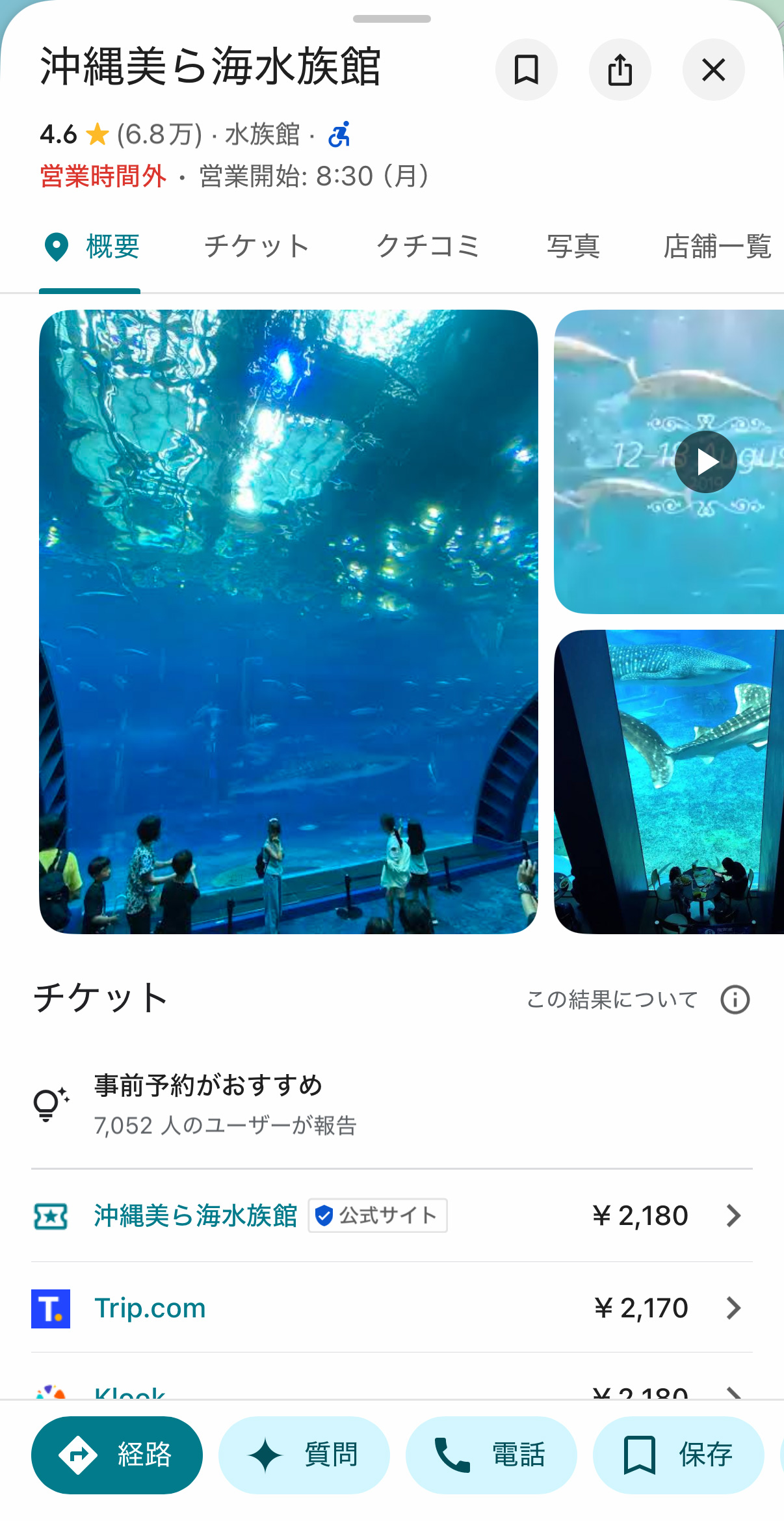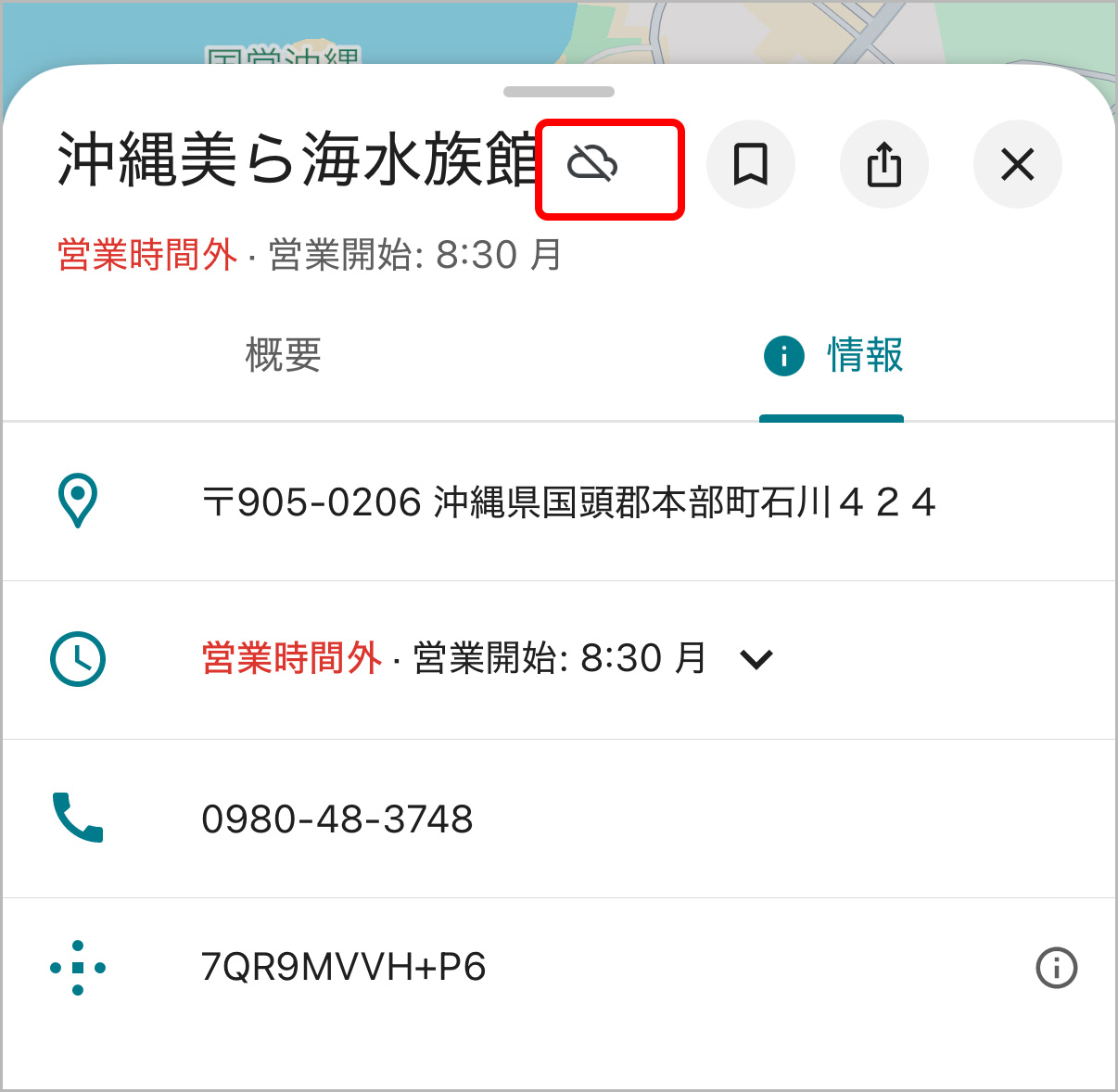 例えば、端末のWi−Fiをオフにし、機内モードにして完全に通信をシャットアウトしてから、マップで沖縄の「美ら海水族館」を開いてみましょう。