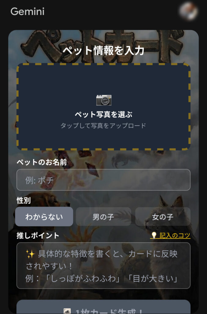 こちらからカード化させたい写真を選んでアップロードし、名前や性別、推しポイントを入力して生成ボタンを押すだけ。すぐに生成が始まります。