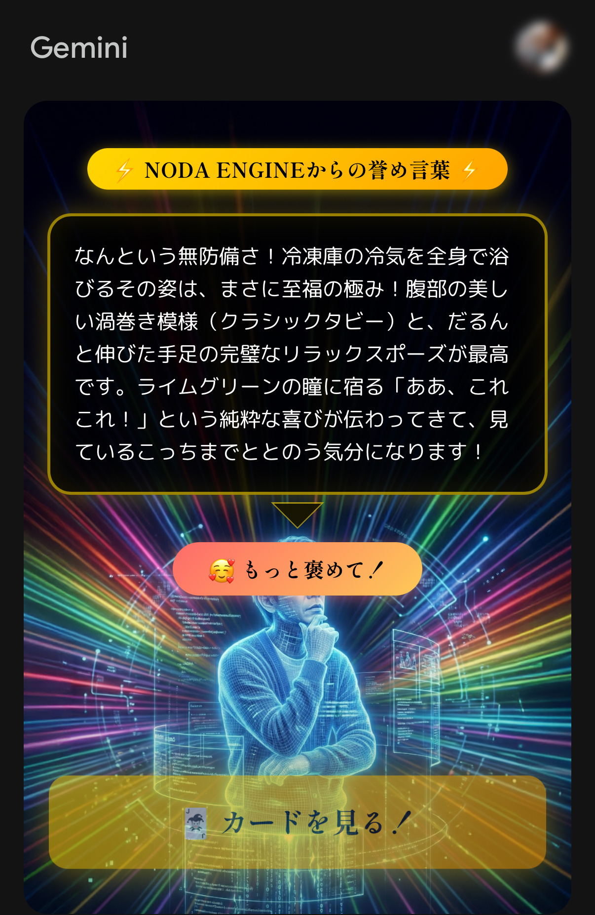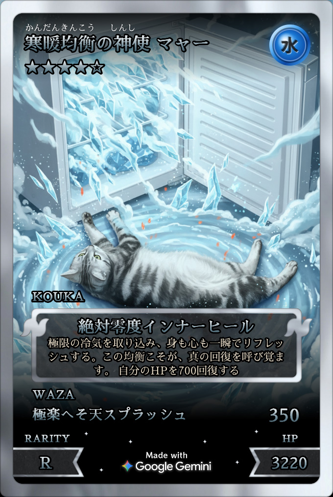 試しに冷凍庫で涼んでいる猫の写真をアップロードしてみると、こんなカードが生成されました。