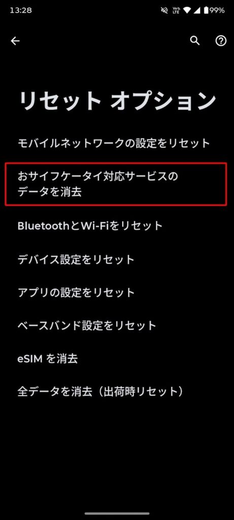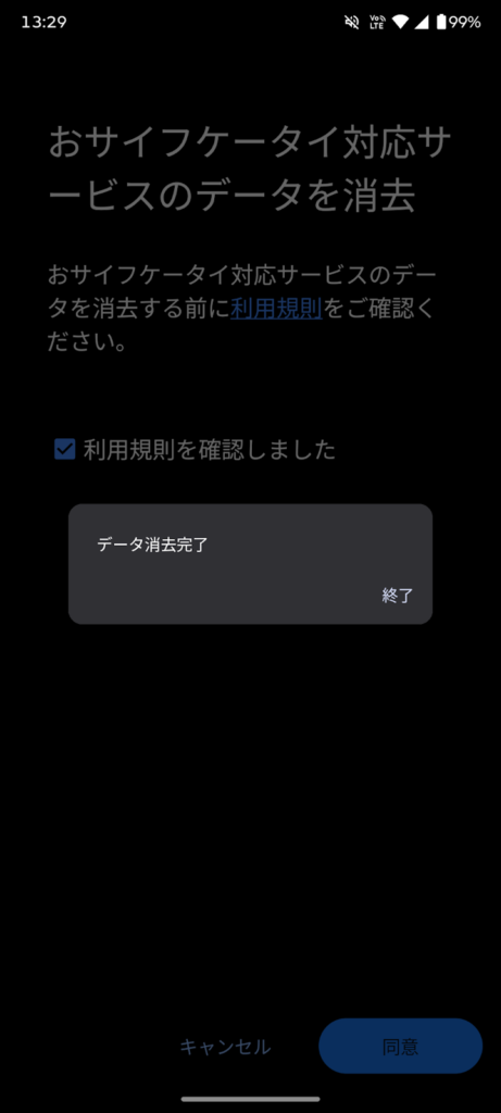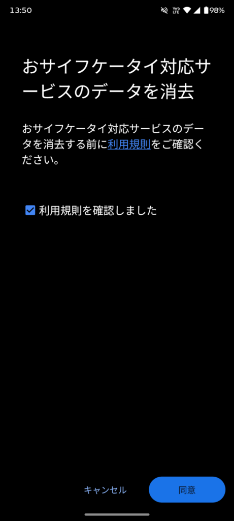 「おサイフケータイ対応サービスのデータを消去」をタップします。