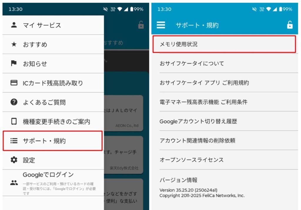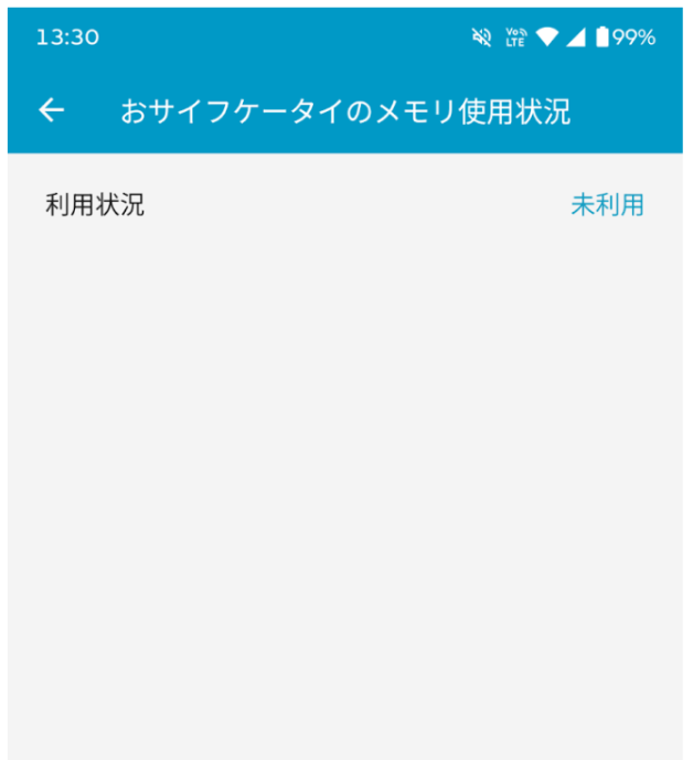 ちゃんとデータが消えているか、確認しておきましょう。「おサイフケータイ」アプリを起動し、メニューの「サポート・規約」→「メモリ使用状況」の順にタップしてください。