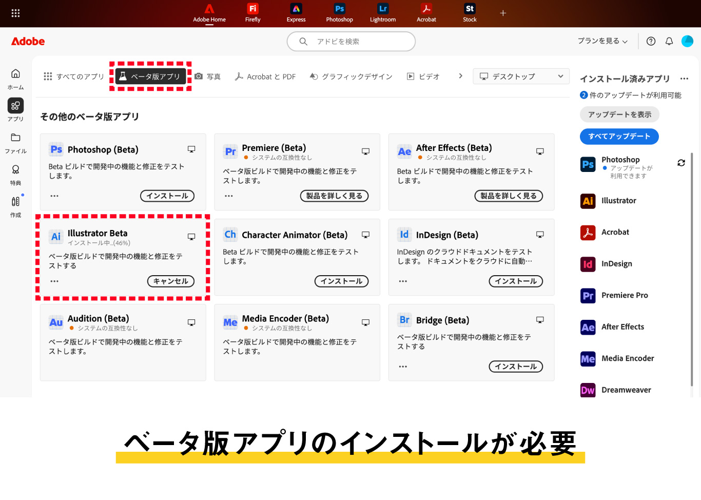 通常版のIllustratorとは別に、ベータ版アプリをインストールする必要があることが判明