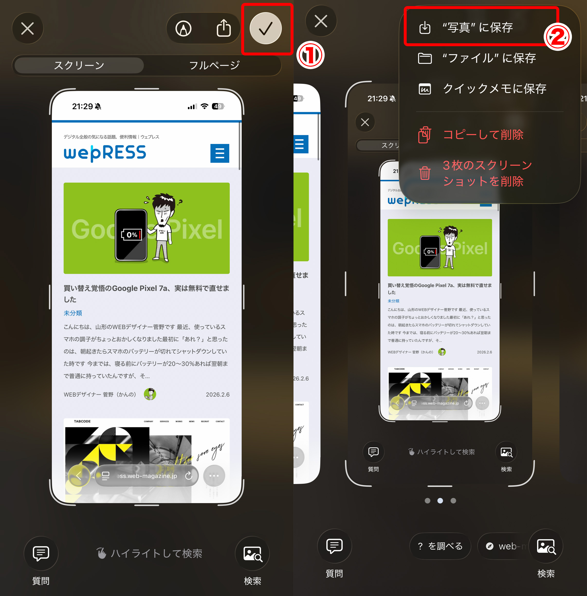 しかもプレビュー画面が表示されるだけならまだしも、画面右上のチェックボタン※① をタップし、さらに「“写真”に保存」※② を選択しないと、スクリーンショットは保存されません。まとめてたくさんのスクリーンショットを撮影したいときにはかなり煩わしく感じてしまいそうです。