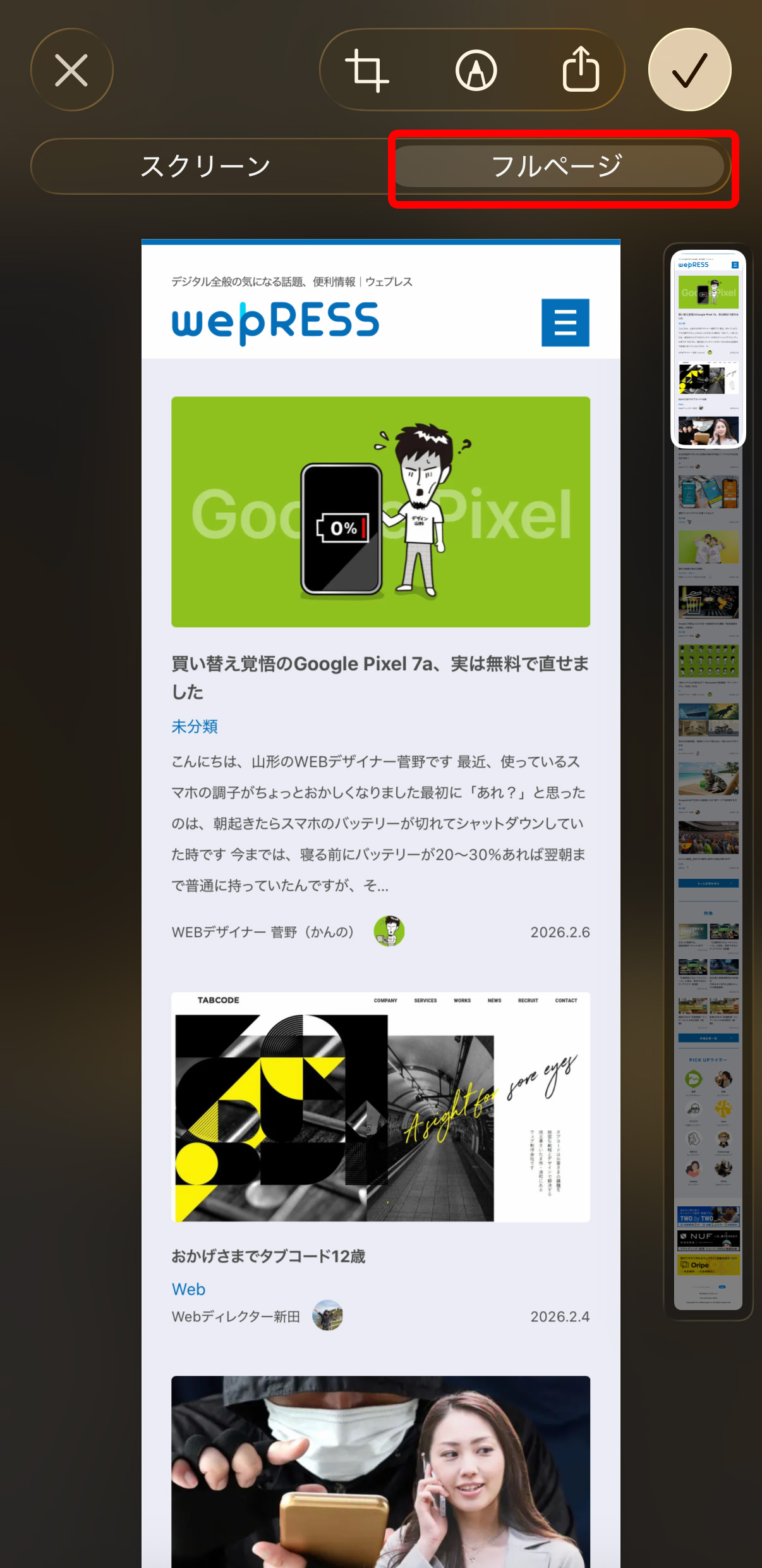 ちなみにこのとき「フルページ」のタブを選択して保存するとSafariなどの画面全体を保存できるので便利。ただし、PDF形式での保存となるため写真としては保存されないので注意が必要です。