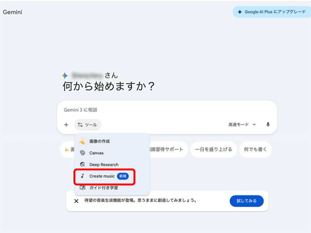 使い方は簡単で、チャット欄のツールアイコンをクリックして「音楽を作成」を選択するか、チャットで直接「曲を作って」と指示をするだけ。日本語にも対応しているので、日本語で指示を出し、日本語の歌詞を指定して歌わせることもできるのです。