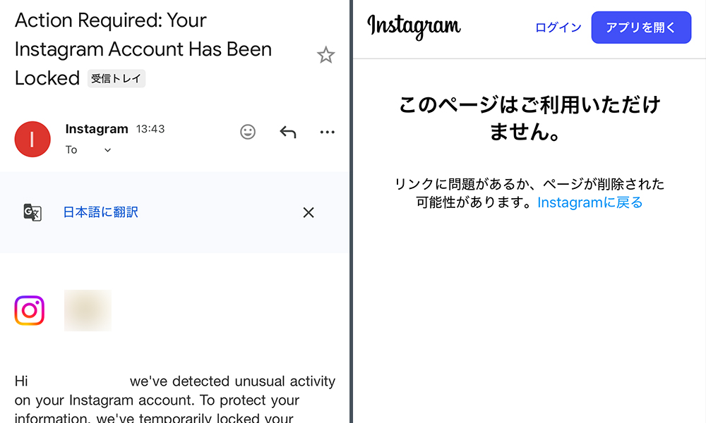 「異常な挙動を検知したためアカウントをロックした」という通知が届きます。