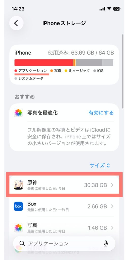 実際にストレージが64GBしかない僕のiPhone 12 miniに、ユーザー数1億人以上の人気ゲーム「原神(げんしん)」を入れてみました。すると、原神だけでほぼ半分の容量が埋まってしまいました。