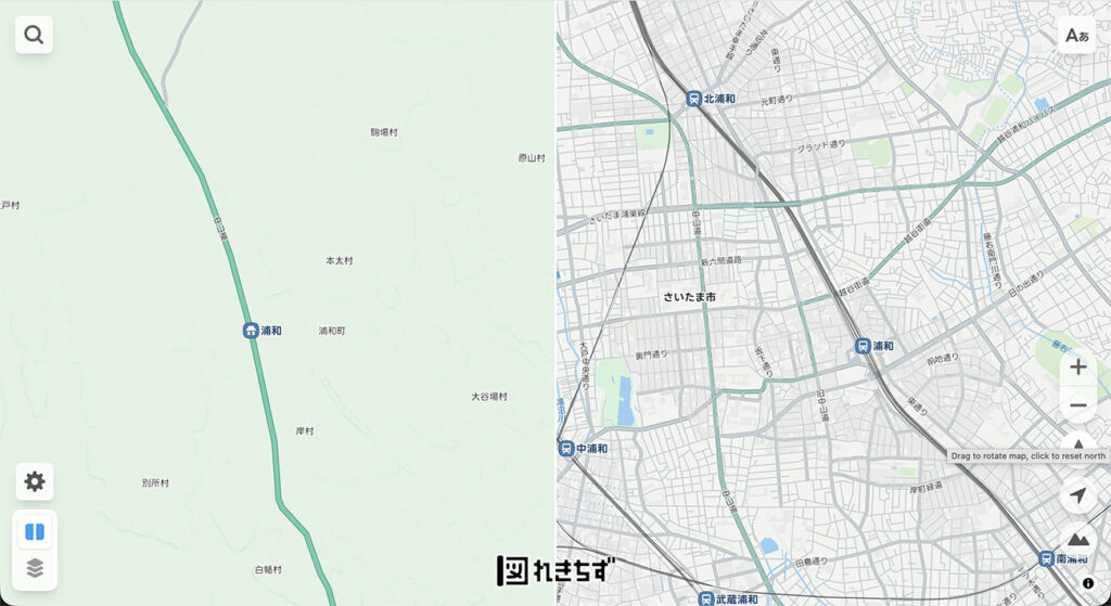 例えば、下の画像は埼玉県さいたま市の浦和駅周辺の地図。左側が歴史地図で、右側が現在です。
