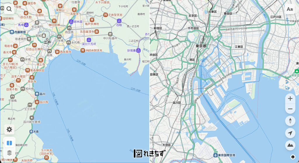 地図を少しスクロールして東京湾に出てみると、湾岸の地形が全然違いました。200年前後で海が相当埋め立てられていることがわかります。ですが、主要な街の名前や位置は結構同じ。どうやって街ができていったのかを実感できるのが面白くて、ついつい時間を忘れて見てしまうんですよね。