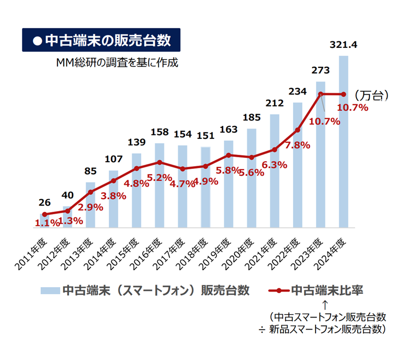 近年はスマホの価格が高騰しており、新品ではなく中古品を検討する人が増えています。実際、総務省の調査によると中古スマホの販売台数は直近5年間で約1.7倍になっているそうです。